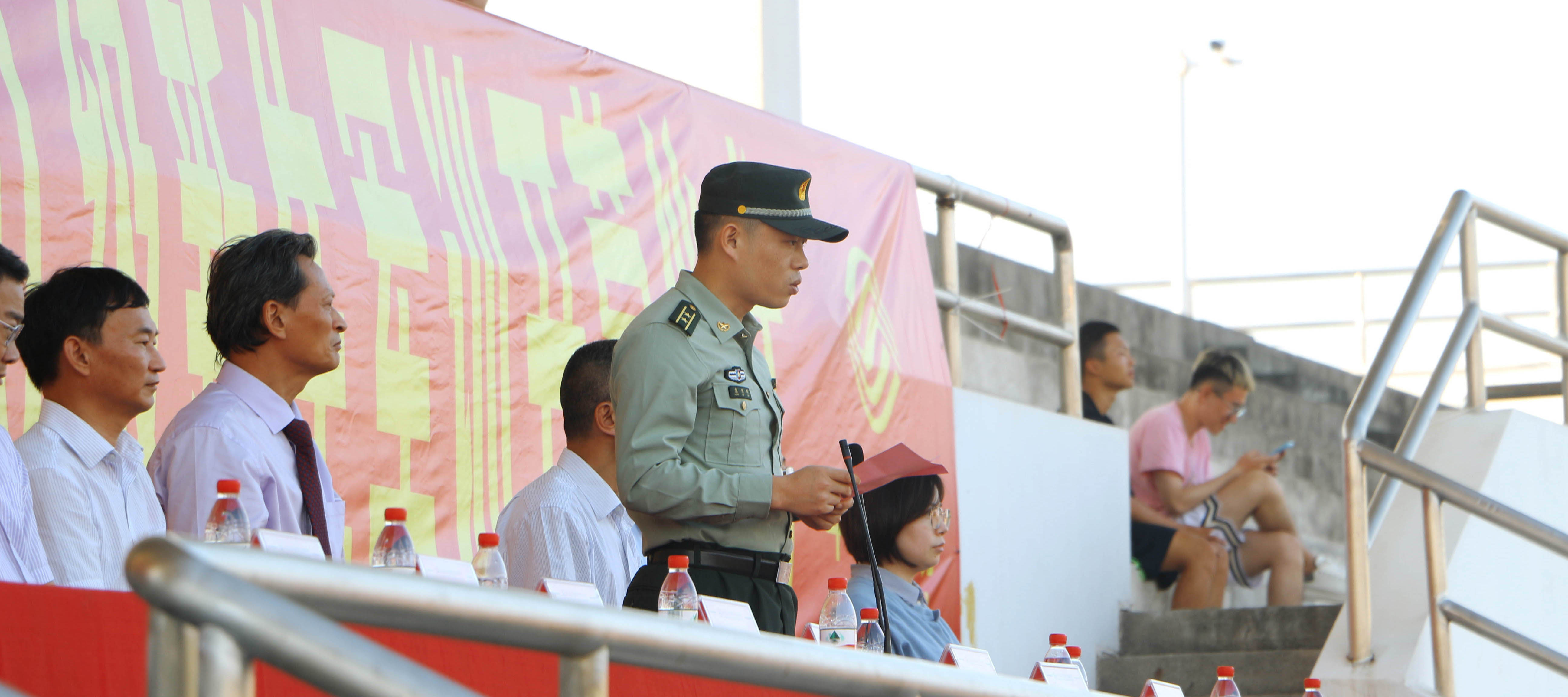 现场,戴炳源向军训团授旗,东莞市军分区参谋长袁煦辉代表军训团接旗。