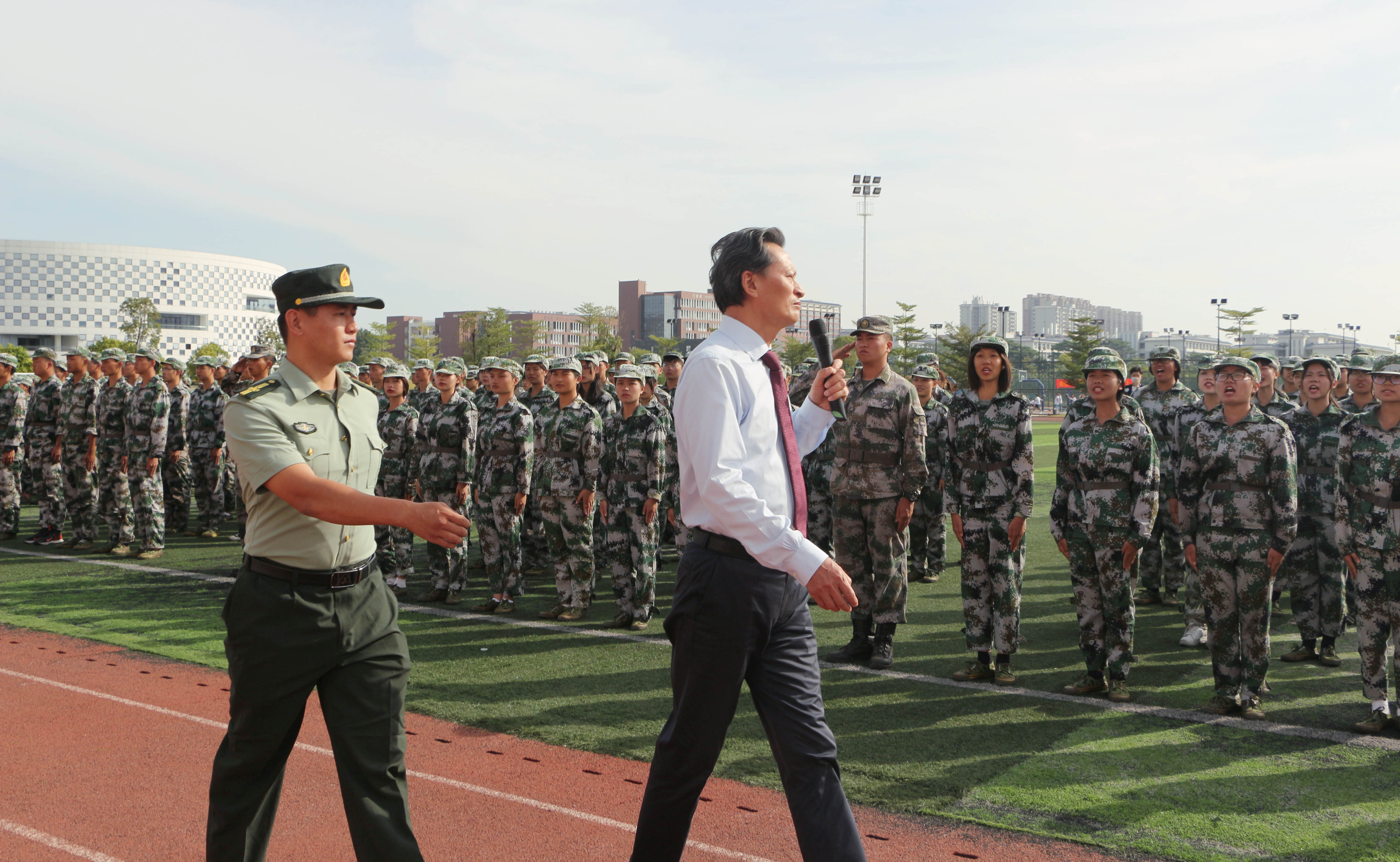 田径场上,全体新生以军人之姿,昂首挺胸,目光炯炯,接受党委书记戴炳源的检阅。