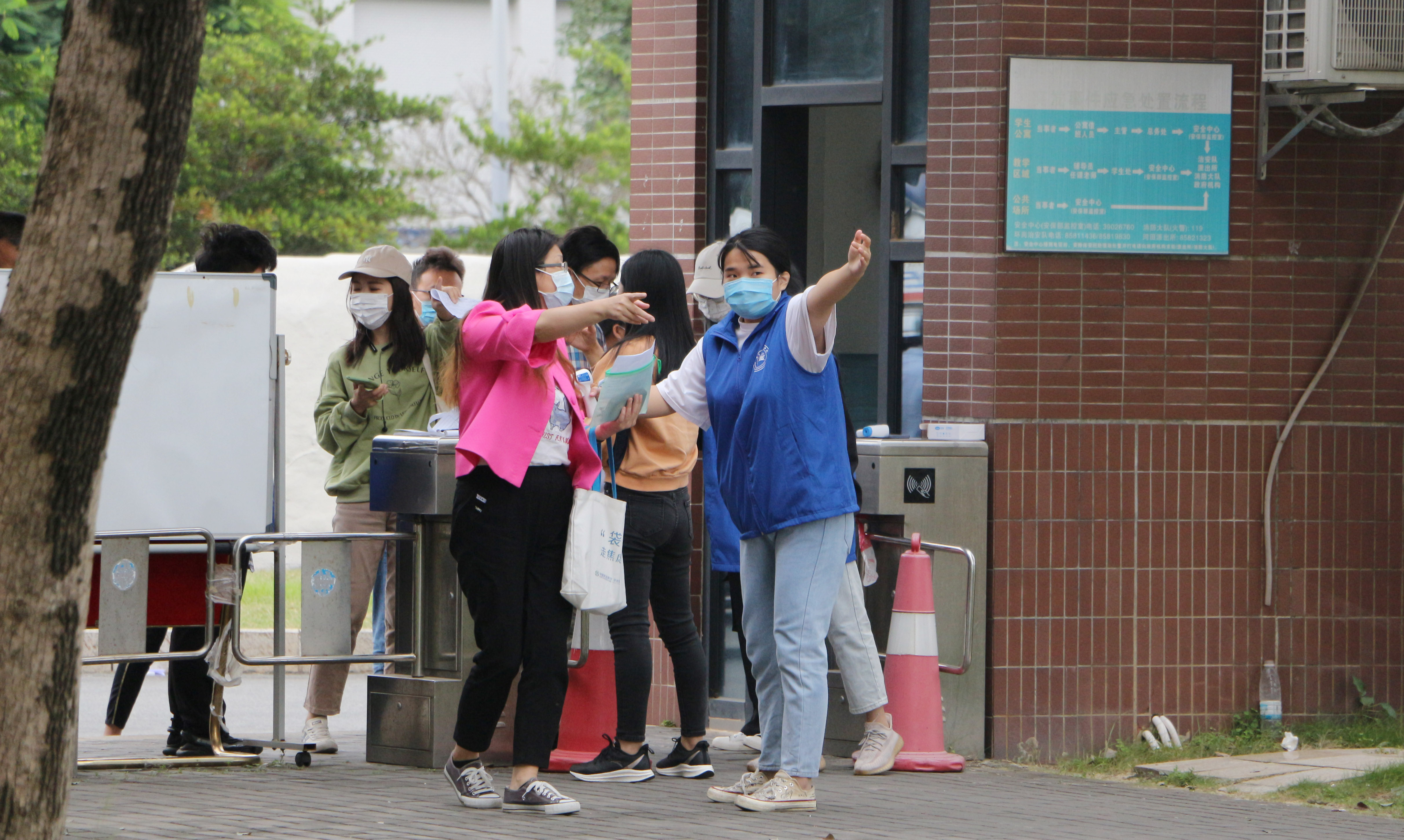 考试首日,所有工作人员及志愿者各就各位。在校门口,安保人员和学生志愿者专门对考生进行健康码核验、体温测量,确保考生一切正常方可进校。校道和考场各路口均设有学生志愿者站岗,为考生指引考场,尽心尽责地提供服务。