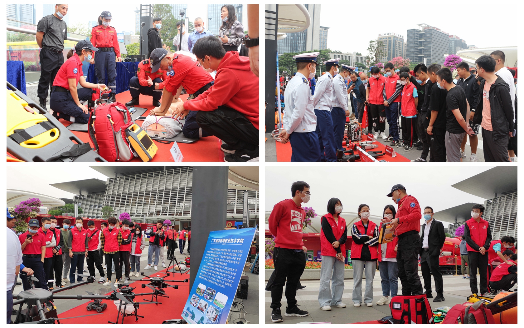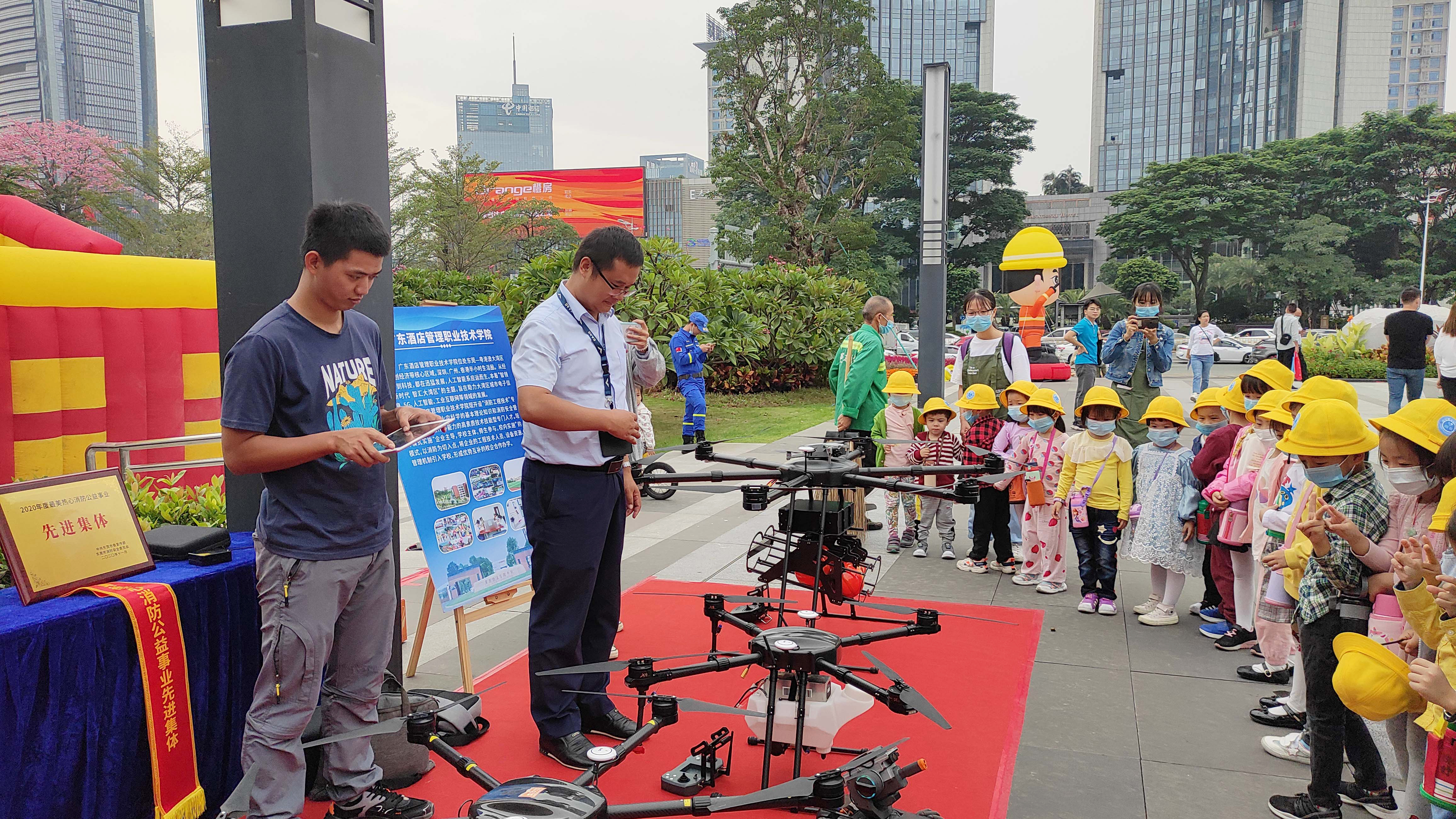 活动现场设有消防装备区、技能展示区、消防答题互动区、消防游戏互动区以及消防着装体验区等宣传展位。其中,我校联合了校方合作企业东莞鹏飞无人机有限公司,在现场布置了VR和无人机互动摊位,除了有VR消防实景体验,还有消防灭火无人机展示等,吸引众多市民前来参观。