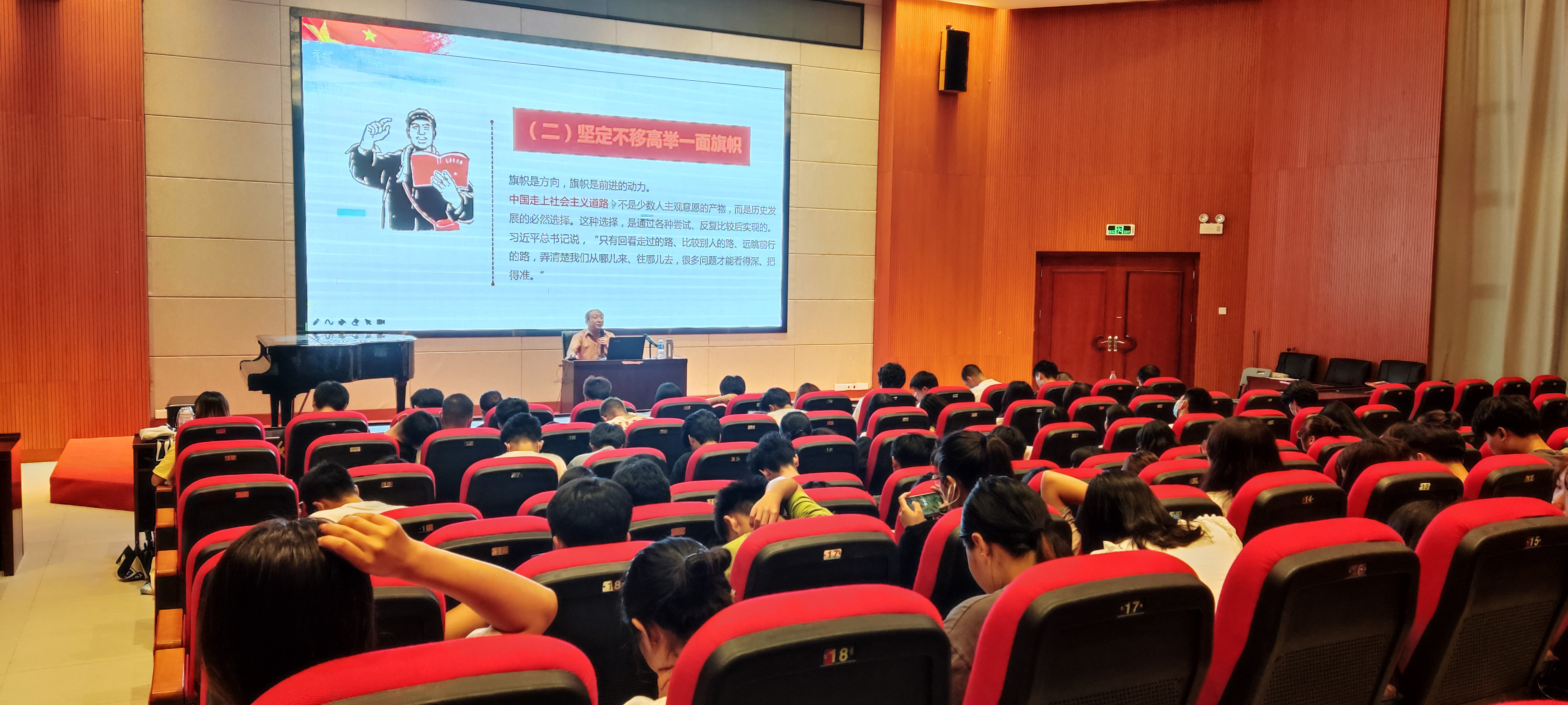 马克思主义学院院长梁金水以建党百年为契机,紧紧围绕“学党史、听党话、跟党走”这一中心,以《做新时代中国特色社会主义建设者和接班人》为题,声情并茂地讲述了中国共产党艰苦卓绝的建党历程,同时深入地分析了中国共产党为什么能、马克思主义为什么行、中国特色社会主义为什么好这三个方面问题。