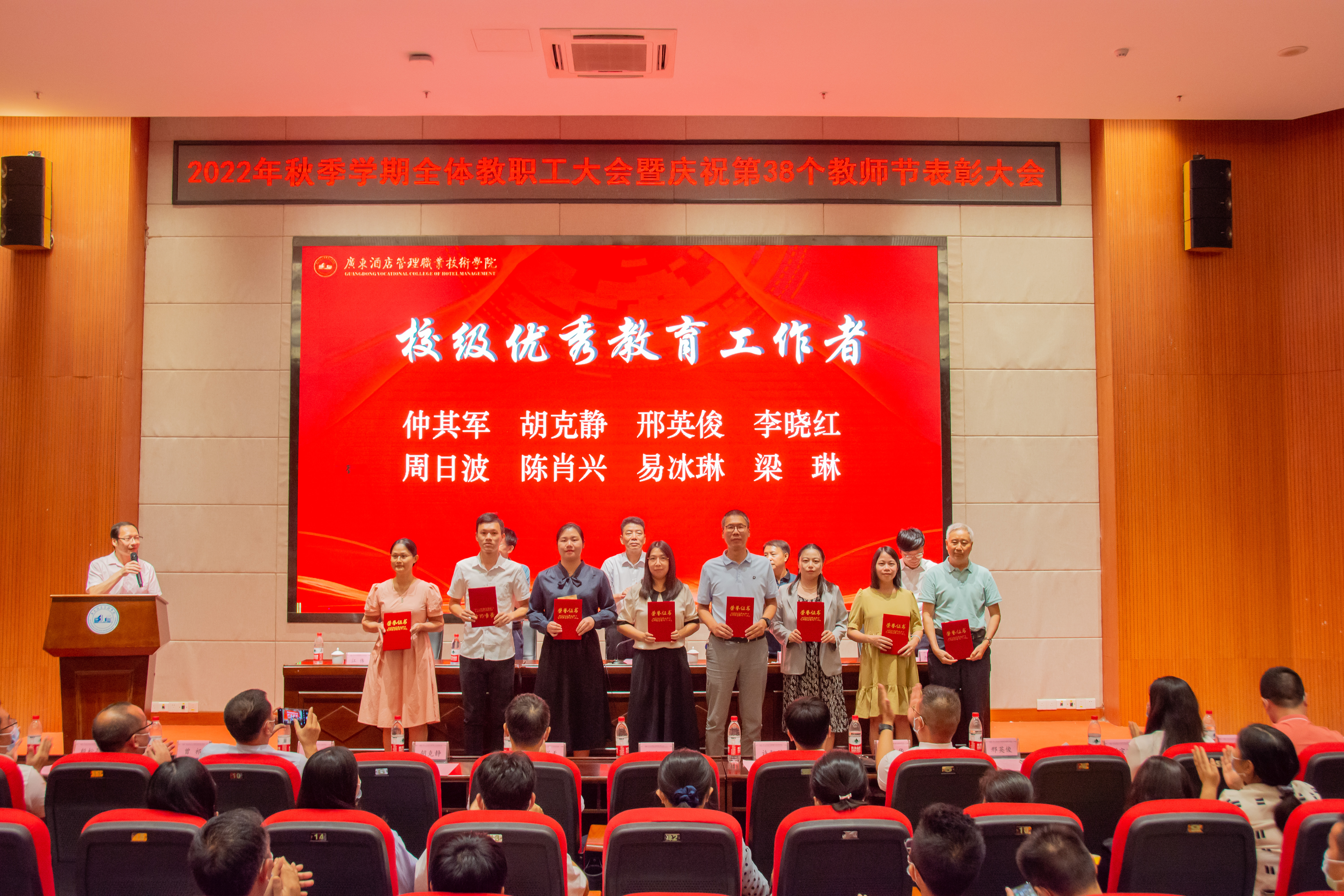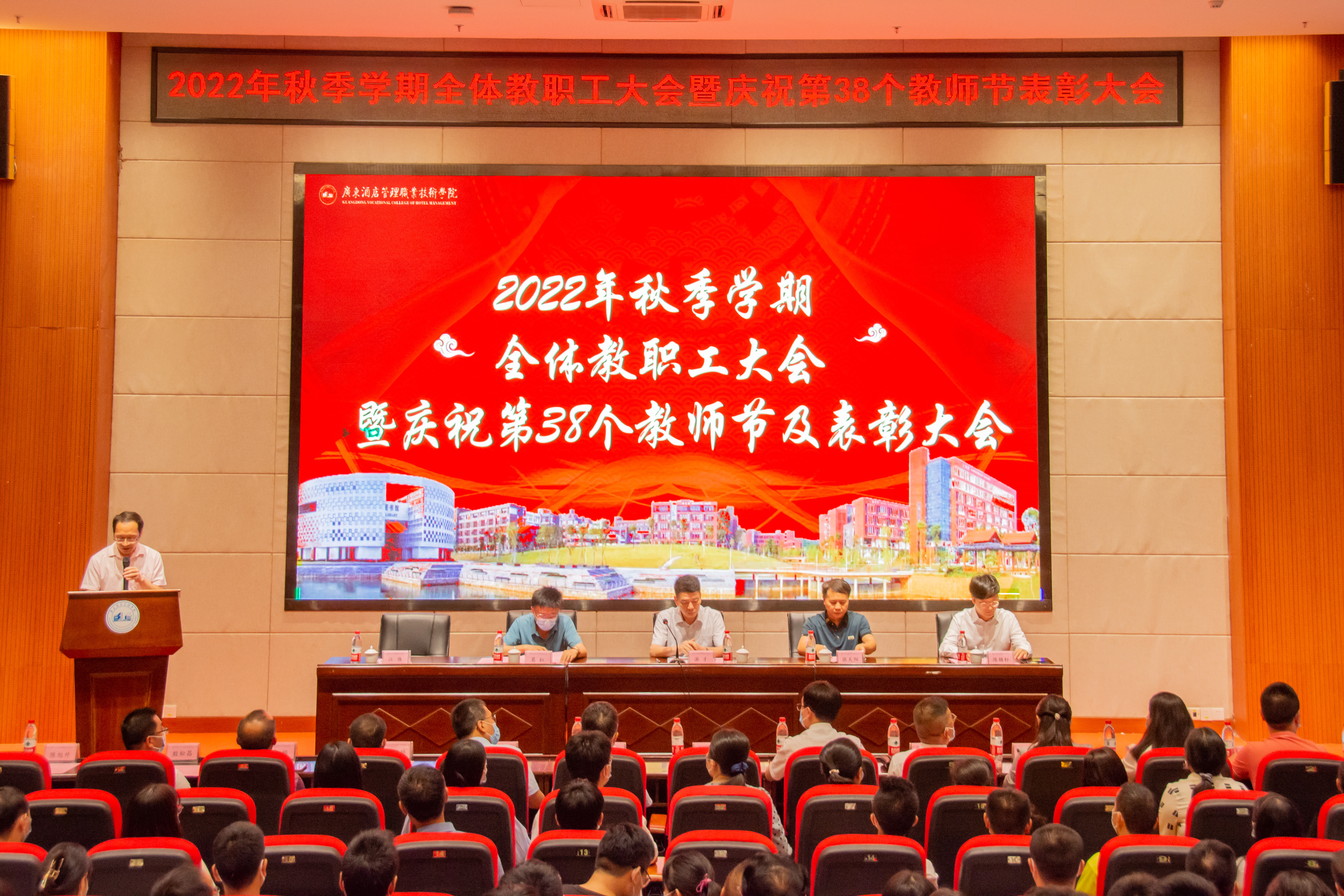 在第三十八个教师节来临之际,9月7日,广酒学院2022年秋季学期全体教职工大会暨庆祝第38个教师节表彰大会在学术报告厅隆重举行。校长汤才、副校长张天阳、副校长葛虹、党委副书记江伟、副校长陈锦轩、全体教师及行政教辅人员参加大会。会议由党委副书记江伟主持。