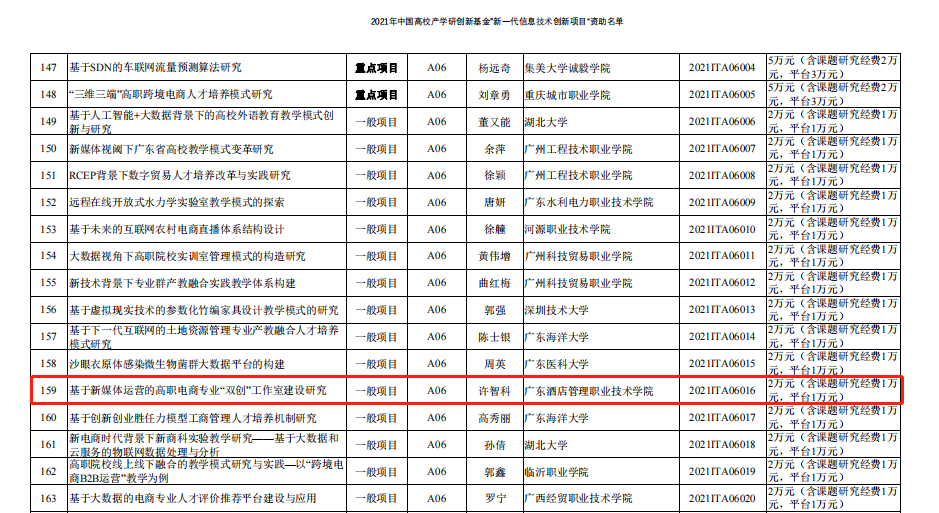 近日,教育部科技发展中心发布了《2021年中国高校产学研创新基金“新一代信息技术创新项目”立项通知》,经济管理学院许智科团队的《基于新媒体运营的高职电商专业“双创”工作室建设研究》获得立项资助。