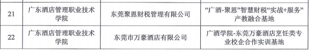 近日,东莞市教育局公布《第二批市高水平校企合作基地立项建设单位名单》,我校《“广酒-聚恩”智慧财税“实战+服务”产教融合基地》和《广酒学院-东莞万豪酒店烹饪类专业校企合作实训基地》获批东莞市高水平校企合作基地立项。此次立项是我校继《数字营销“训-赛-研-培-创”五位一体实训基地》后,再次获批高水平校企合作基地立项。实训基地项目分别依托省级电子商务、烹饪工艺与营养高水平专业群,联合诚丰信企业服务公司、聚恩财税公司、东莞万豪酒店,对接东莞市行业企业,提供基于岗位实践的实训条件,实现高水平产教融合,服务“湾区都市、品质东莞”建设。